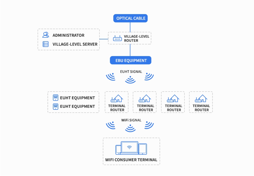 Connect optical fiber of telecom operators to village routers and install 2-3 central access devices on the holder according to the terrain and landform of the village. The central access devices access village routers through the network cable, and cover EUHT to the whole village with directional antenna.
