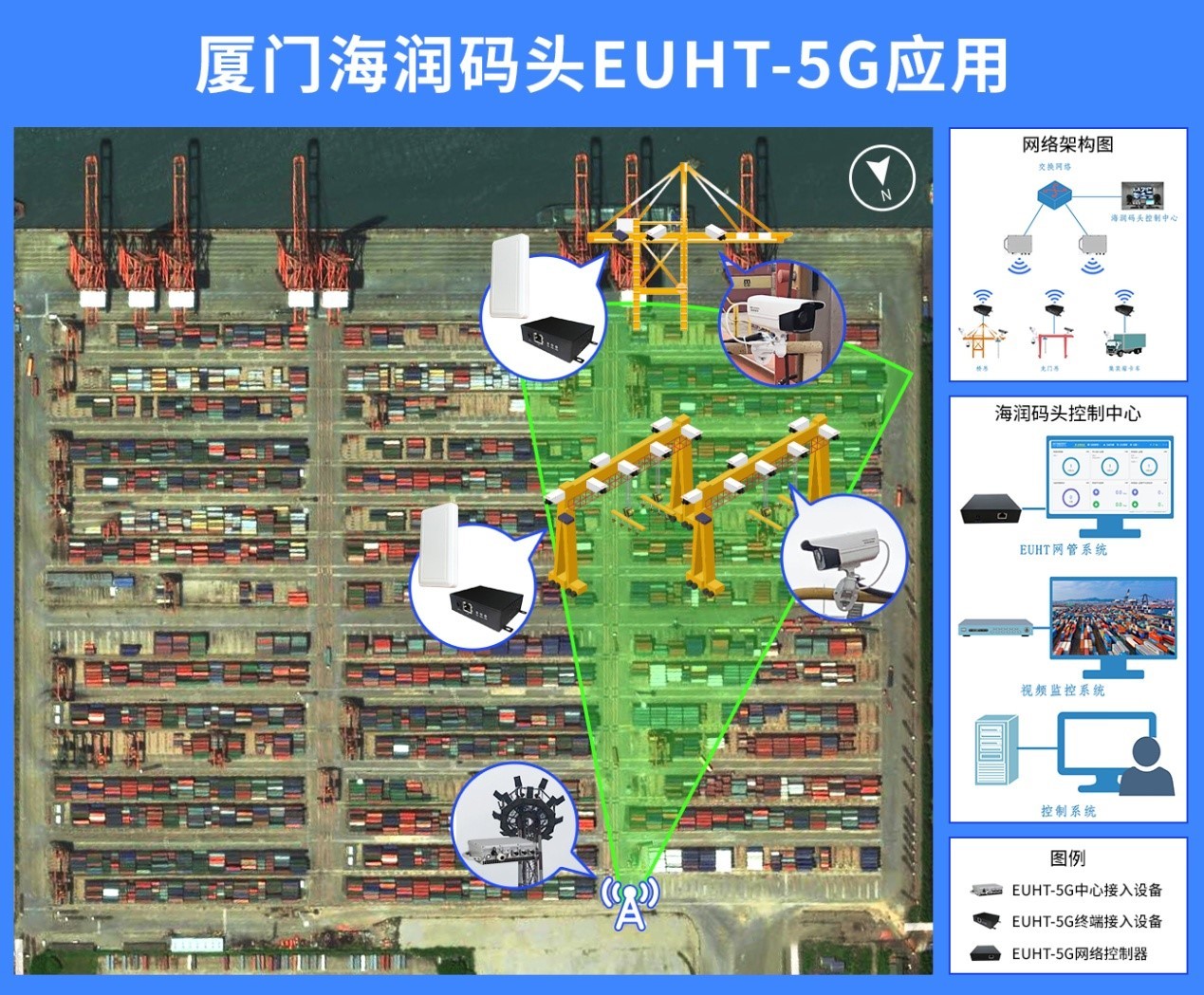 2020年5月,廈門某大型集裝箱集團(tuán)公司在其下屬碼頭進(jìn)行EUHT-5G網(wǎng)絡(luò)的試點(diǎn)應(yīng)用。試點(diǎn)對(duì)碼頭試點(diǎn)區(qū)域進(jìn)行EUHT-5G網(wǎng)絡(luò)覆蓋,實(shí)現(xiàn)碼頭輪胎式龍門吊、橋吊高清視頻實(shí)時(shí)回傳、內(nèi)部集卡高清視頻實(shí)時(shí)回傳及運(yùn)行軌跡可視化管理、橋吊遠(yuǎn)程控制的創(chuàng)新應(yīng)用試點(diǎn)。