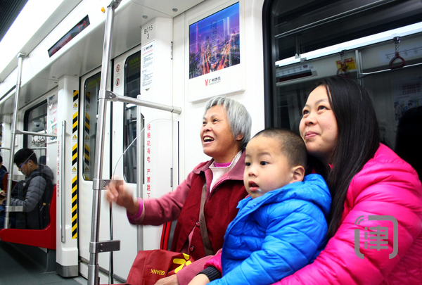 日前,廣州地鐵新開通線路14號線知識城支線實現了全球首次全車30路高清視頻監控,每節車廂、司機室均裝有高清攝像機,全車30路高清視頻監控無死角,無論高峰擁擠還是人員稀少時段,車廂視頻信息都可以直接傳送到地鐵控制中心和公安值班室,實現真正的車廂視頻實時監控。圖為廣州市民興奮的乘坐新開通的地鐵列車。