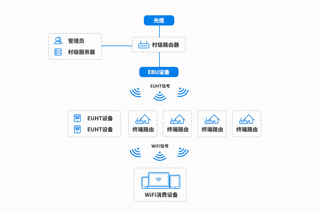 每個農(nóng)戶派發(fā)終端接入設(shè)備,終端接入設(shè)備的作用是接入EUHT無線網(wǎng)絡(luò),并將EUHT網(wǎng)絡(luò)轉(zhuǎn)換為WIFI網(wǎng)絡(luò),為農(nóng)戶提供上網(wǎng)服務(wù),支持多臺電腦、平板、智能手機等WIFI無線終端接入互聯(lián)網(wǎng)。